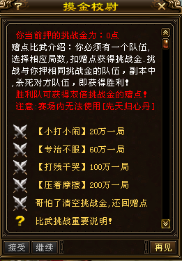 9.【挑战缥缈峰】:1万增点票、5万增点票、功力丹、属性称号兑换材料
